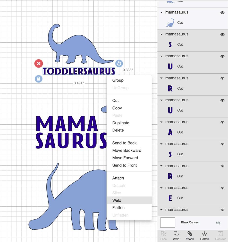 One of my favorite things about Cricut Design Space is that it automatically sorts your layers by color. One of my least favorite things about it is that it also wants to automatically arrange your text to save as much space as possible. To prevent the software from dividing up my letters, I selected all of my text and pressed the “weld” command. This made it so that Design Space was able to read it as one piece and will therefore made arranging my final cut design easier.